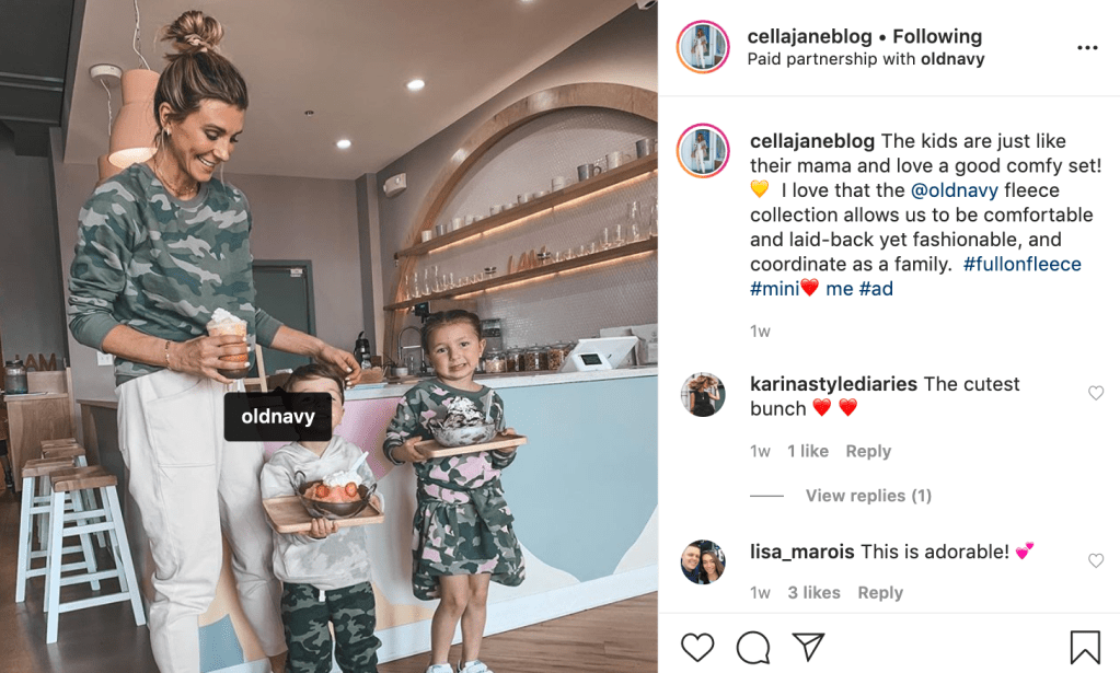 In one post with a paid partnership with Old Navy, she writes on Instagram, “The kids are just like their mama and love a good comfy set! I love that the @oldnavy fleece collection allows us to be comfortable and laid-back yet fashionable, and coordinate as a family. #fullonfleece #minime #ad. The photo shows her and her two children in coordinating Old Navy comfy clothes going out for a sweet tweet, staying relatable to her target audience, which is mostly young mothers like her.